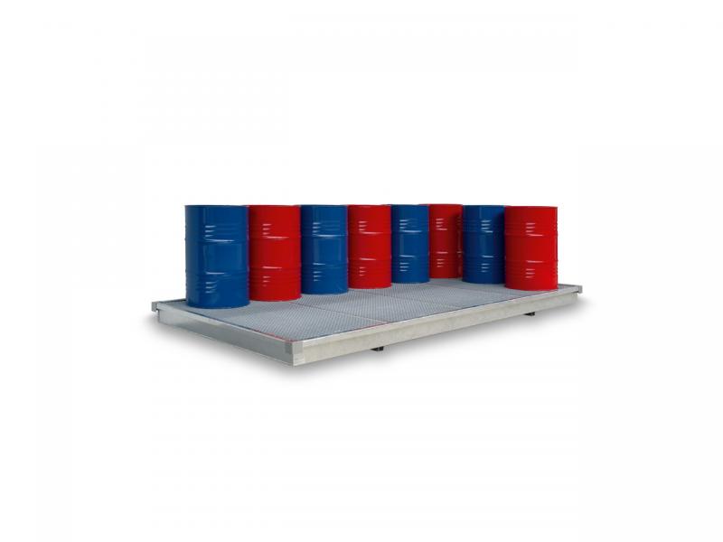 Eine große Lagerfläche bietet diese verzinkte Stahlauffangwanne mit 8 m² und einem Auffangvolumen von 1.050 l für die Lagerung von Fässern, Tankcontainern und Fasspaletten.