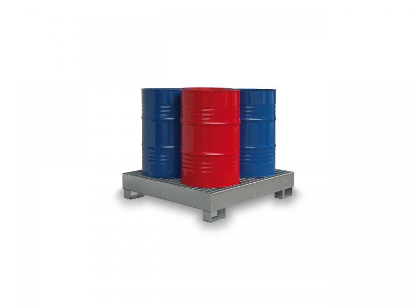 Diese Stahlauffangwanne ist fast quadratisch und verfügt über eine Lagerfläche auf der 4 Fässer mit 200 Liter Fassungsvermögen stehend abgestellt werden können.