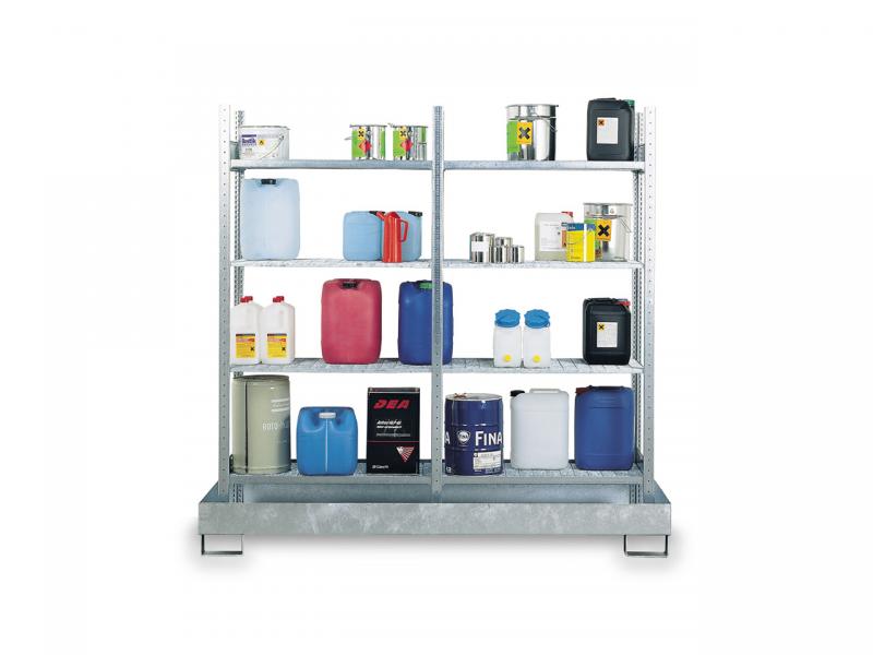 • Bestehend aus: 3 vormontierten Stützrahmen, 2 x 4 Gitterrostregalböden, 1 Auffangwanne 200 l