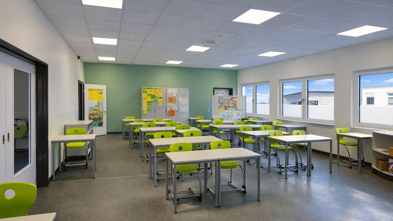 Die Innenräume sind bewusst ruhig, modern und robust gestaltet. Helle Oberflächen, eine durchdachte Raumaufteilung und langlebige Materialien sorgen für eine Atmosphäre, in der sich Schülerinnen und Schüler ebenso wohlfühlen wie Lehrkräfte.